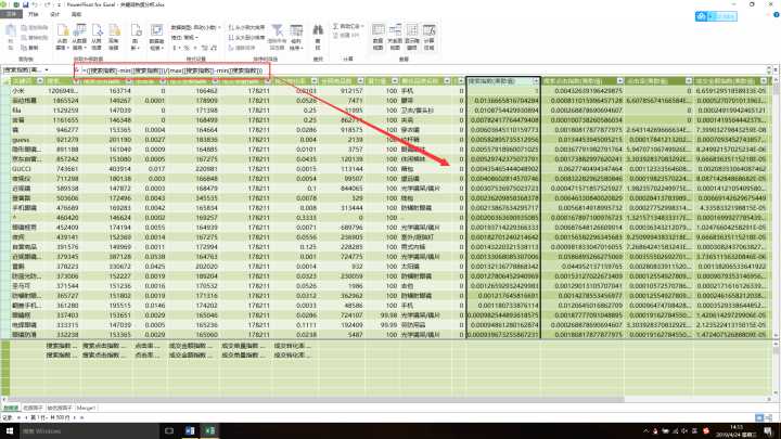 结合PowerQuery和PowerPivot,在数据模型当中直接计算出“搜索指数”“搜索点击指数”“点击率”“成交金额指数”“成交转化率”,就可以轻松计算出各自的离散值是多少。这里要跟大家强调一下,每个指标的离散值只能内部对比,不能跨指标对比。