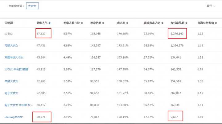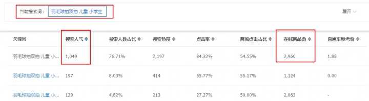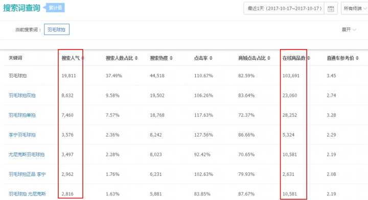 so:相关性差的不要、转化率低于1%的不要、搜索人气1000以下的不要、相对在线商品数高的不要。
