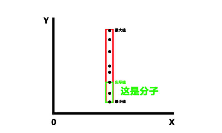 当然,前提就是要给这堆搜索指数进行降序排序或者升序排序。让数据沿着同一条直线上进行分布。那么离散化的公式分母就是数据的总长度,也就是红色框框的长度。而分子,就是实际值与最小值之间的总长度,也就是绿色框框的长度。那么,最终的离散值,其实就是这2个框框的面积占比。因为这里的分子最大只能等于分母,最小为零,所以最终的离散值最大值是1,最小值是0,但一般都是落入这个区间里头的。