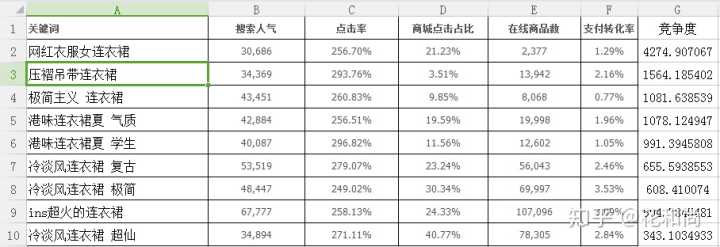 然后同样的方法,我们再用“连衣裙”去搜索筛选。最终得出这张表格,