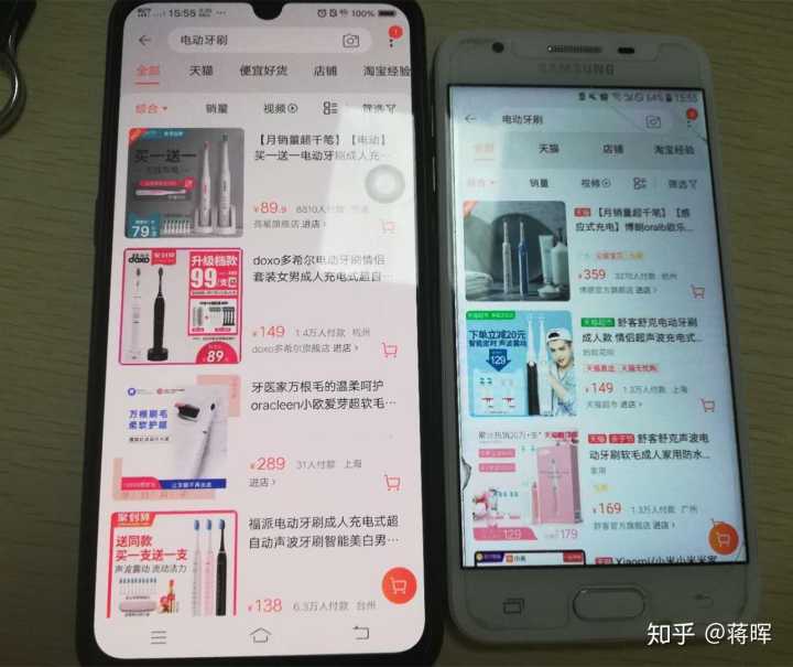 我用两部手机,搜索同一个关键词“电动牙刷”,搜索出来的产品是不同的。