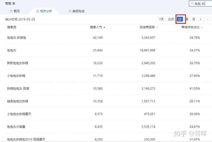 以行女包为例,通过“生意参谋-市场-搜索分析”,输入“包包 女”,然后按照搜索排名,注意这里是一天的数据。