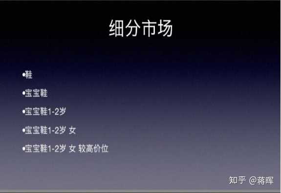 比如说你想卖鞋,鞋这个市场本身非常的大,首先进行切分,锁定宝宝鞋这个市场。但其实宝宝鞋还是很大,我们可以再次进行切分,比如年龄细分,宝宝鞋1-2岁。年龄细分完了之后还可以继续,性别细分,比如宝宝鞋1-2岁 女;还没完,在这里头还可以进行高价格细分,比如宝宝鞋1-2岁 女 较高价位。