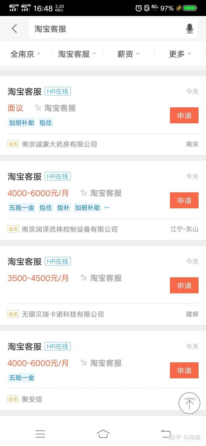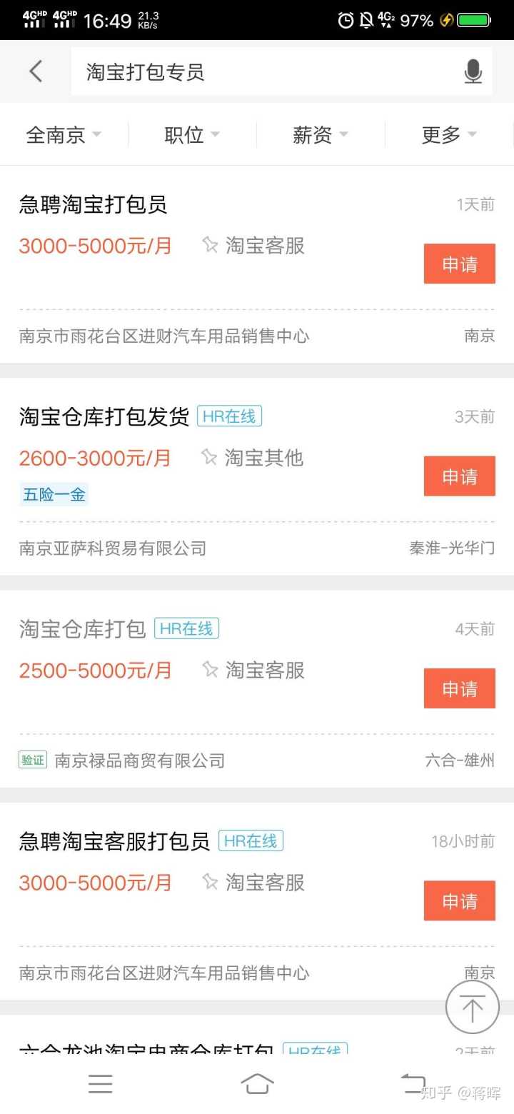 这是南京地区的客服、打包专员的薪资待遇截图,客服、美工的薪资一般在四五千左右,打包专员一般在三千到四千之间。