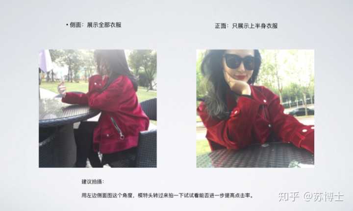 我们可以假设一下如果左图这个坐姿保持不变,但是模特的脸转过来对着观众,效果会不会更高呢?这里我只是给大家提供一个制作主图时的思考方式,因为你用不同的角度展示产品,所获取的点击率也是不一样的,希望大家能善于思考,多尝试不同的拍摄角度来展示自己的产品。