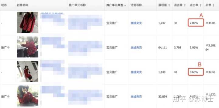 这里举个栗子,同样一件产品,有四张主图通过直通车投放,B是卖家原先使用的主图,按照个人直观感受来说的话,这张图没有任何问题,已经把能展示的内容都给买家展示了,可是根据实际投放的数据来看的话,它只有3.68%的点击率,而表现比较出色恰恰是第二张和第四张,另外第一张图片2.89%的点击率更是和其他几张主图形成了鲜明的对比。