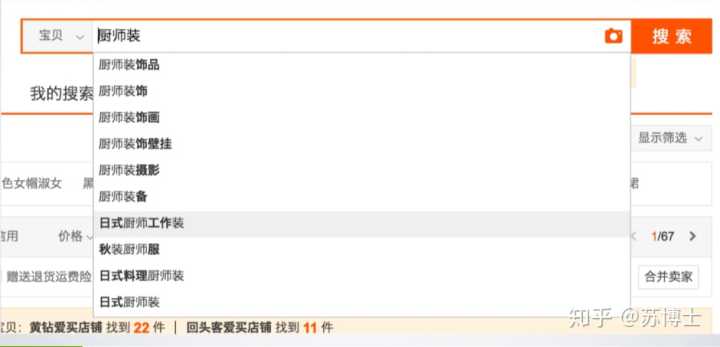 举个例子,比如我们搜“厨师装”,会发现厨师装下面还有“日式厨师装”,厨师装是一个品类,而日式厨师装又是这个品类中的再细分,如果有正在做服装的朋友不妨借鉴一下这个方法,多观察,多留意生活中一些别人注意不到的小需求。