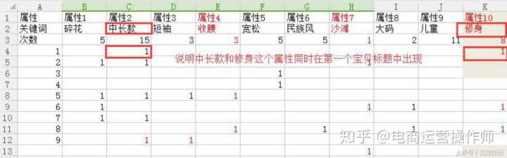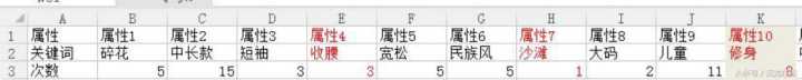 9.在数据里寻找绵绸连衣裙的各种属性,如:显瘦、修身、碎花等,并筛选每个属性出现的次数,最少找出10个属性,随后新建表格如下2图所示: