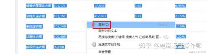 8.在生意参谋里按照搜索指数指标进行降序排列,搜索“绵绸连衣裙”,重复步骤1.2.3,将所得的数据复制粘贴到Excel表格里。