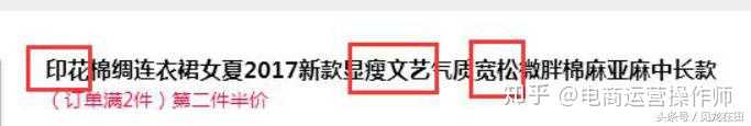 打开淘宝首页,搜索“绵绸连衣裙”,找出前十位的宝贝标题中含有的属性,注意:不能选择销量过低的宝贝。并在表格里标记出来,如下2图所示: