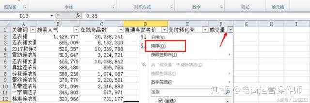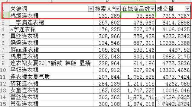 7.将暂时不需要的数据进行右键隐藏,只留下搜索人气和在线商品数量、成交量,对在线商品数进行升序排列后,可选出成交量较高,而在线商品数最少的关键词——绵绸连衣裙。