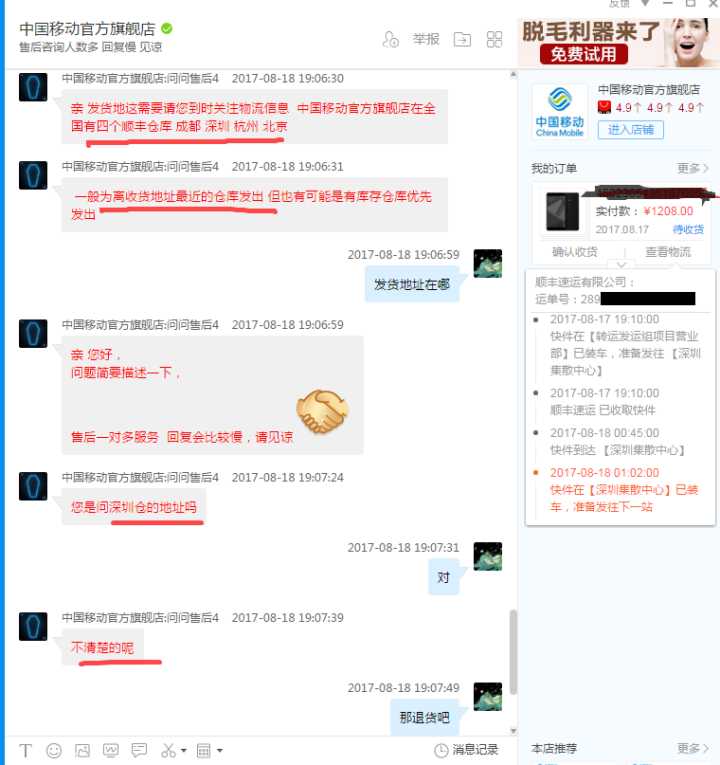 没毛病,客服说中国移动官方旗舰店在全国有四个顺丰仓库 成都 深圳 杭州 北京 ,结果偏偏从深圳发货,我问你们仓库在哪,客服说不知道,这其中不是有猫腻吗?顺丰可以整整一天还蜗居在发货地的集散地!?然后售后客服说自己家的仓库发货地址都不知道?并且他们家客服和死了一样,半个小时一个小时后都没有人。