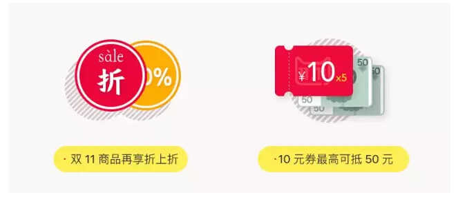 本次双十一营销工具主要有购物券、抵扣券、无限制天猫红包。其中双11购物券面额为10元,从11月1日0时起开抢,一直持续到11月10日23:59,每日限量抽奖发放。