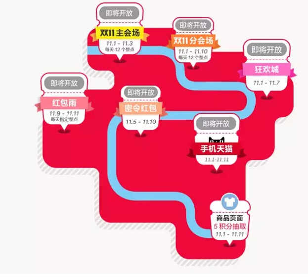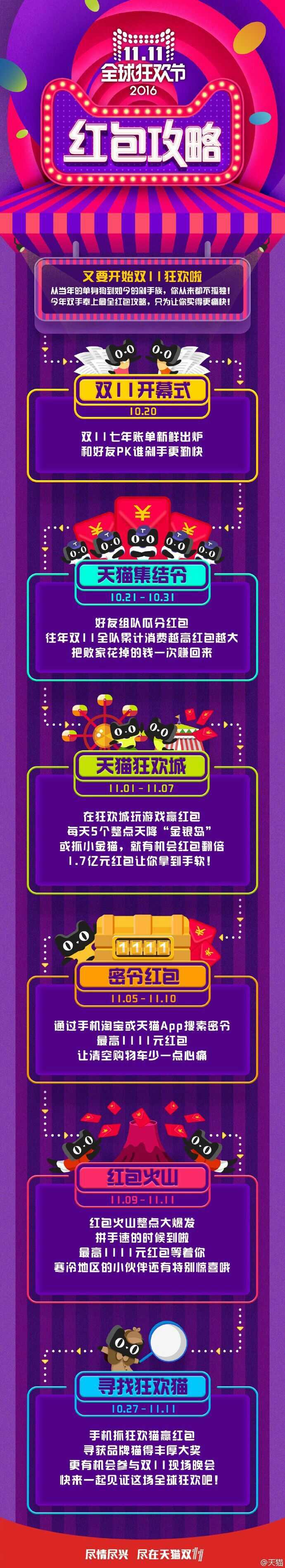 带着学习动力,可以到今年天猫双十一的活动会场页面仔细的品读下,因为每一个活动的具体详细规则都是值得我们学习研究。比如它的红包获取和发放的规则与手段,红包的使用门槛设计,以及为何双十一当天的秒杀只安排了母婴与服装2个类目?
