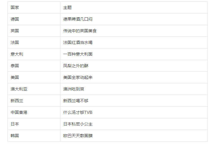 全球化意味着更加丰富的境外商品,这对消费者本身来说就是新鲜的,也给阿里的运营们带来更多的营销方式与更高的竞争壁垒。比如最近阿里正在大力推广的超级国家日,10月21-10月31日的10天里每天推荐一个特色国家主题,涵盖了各国家和地区的吃喝玩乐。我把主题整理出来了,大伙可以感受下阿里运营的话题挖掘功力。