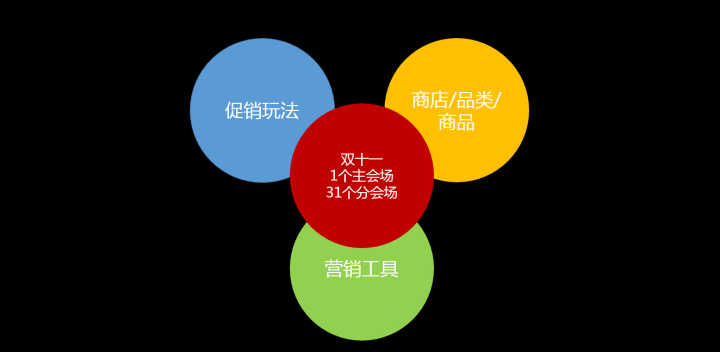 今天2015年淘宝天猫双11共设置1个主会场,31个分会场(包括12个特色会场),以及25个大促外场。虽然页面很多,但逻辑基本一致,因为每一个会场的每一个版块活动,都可以简化成以下模型:商品/品类/商店+促销玩法+营销工具。