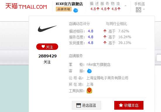 2.我自己就做的天猫,一般天猫旗舰店都需要拿到品牌的独占授权书,简单来讲就是NIKE品牌总部给了授权,而且是独占的授权(旗舰店只有一家),可信赖度是比较高的;线下的专卖店也是拿专卖店授权的,本是同根生,相煎何太急;