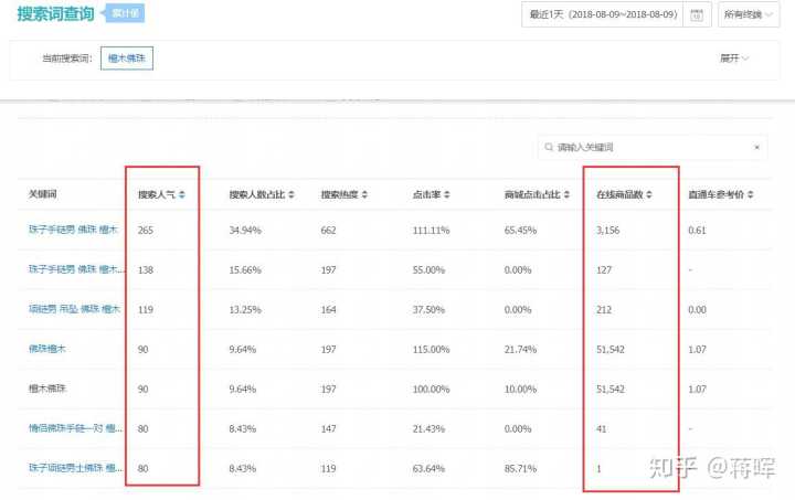 去生意参谋看了一下这个产品,关键词檀木佛珠,搜索人气,在线商品数,这么低的搜索人气下,还有这个多的在线商品数竞争,难度是很大的。