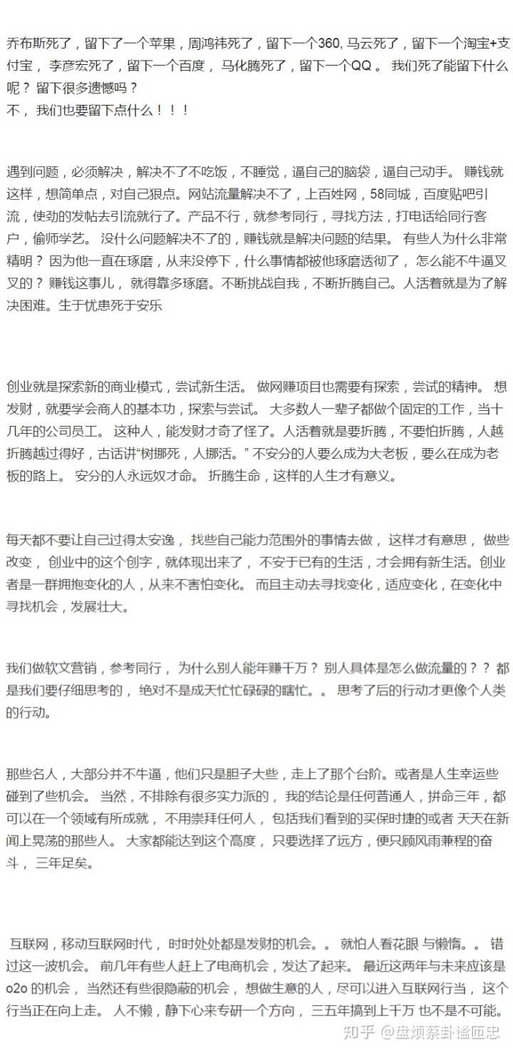大家听明白了吗?赚钱就是这样一个思路。用别人的人力,物力 加自己的脑子。自己永远不干具体的活。只负责吹牛加把控方向,不 断的忽悠人去做项目,自己开发项目,指导个方向就 ok 了。这招,其 实是我从马云身上活学活用来的。我研究马云,就发现,他就是只负 责吹牛加方向,永远不干具体的活。