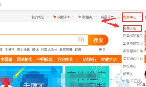 2、在页面的右上方找到卖家中心,然后点击“免费开店”。