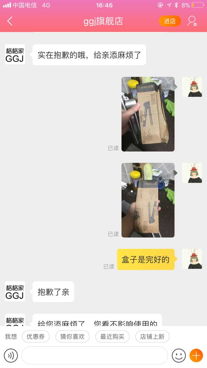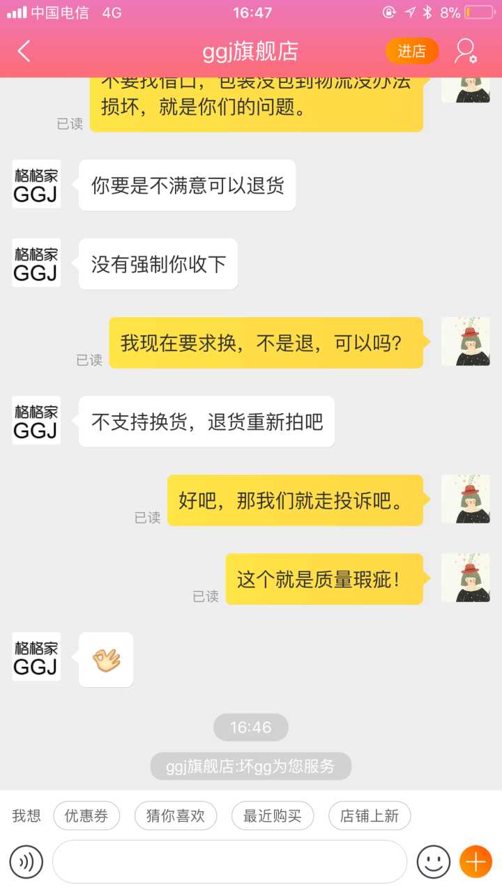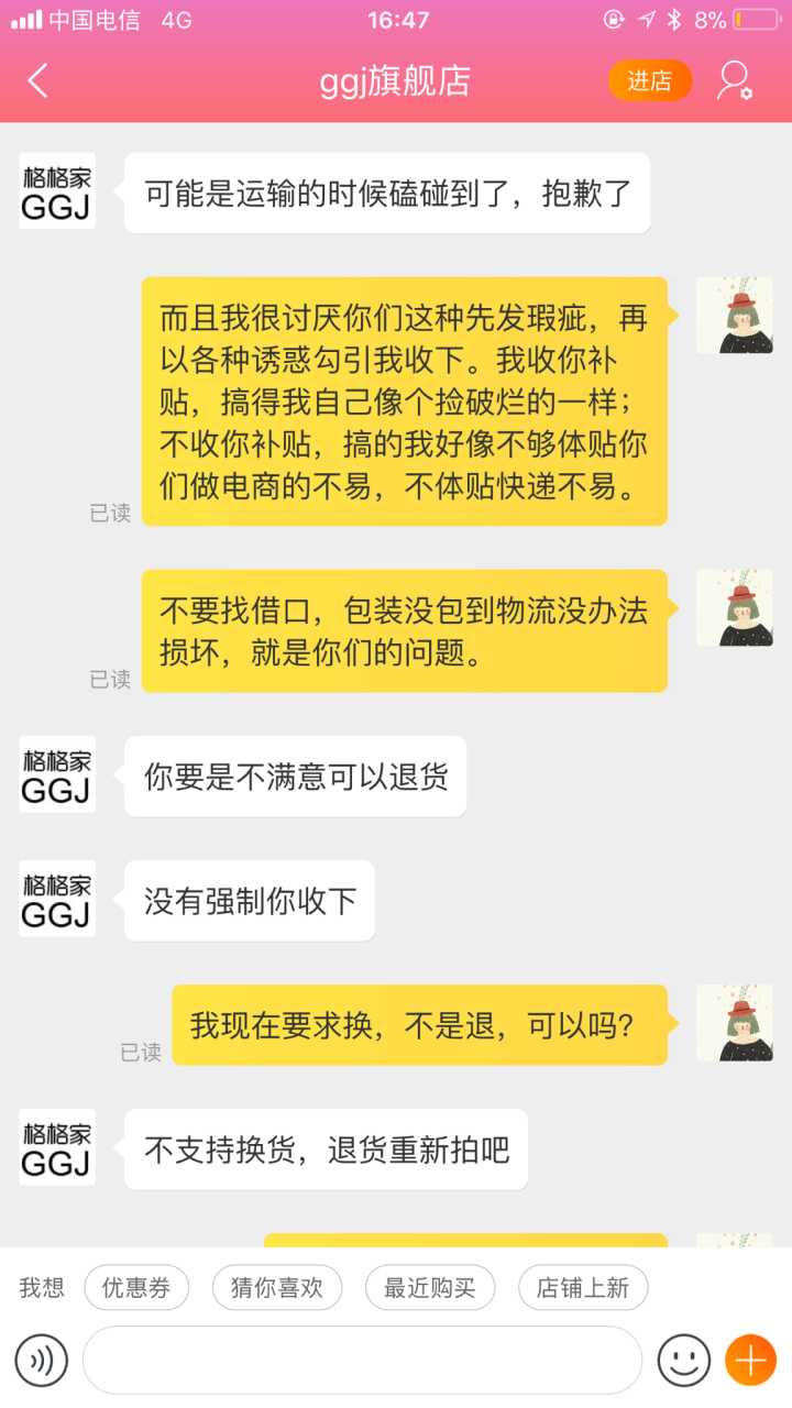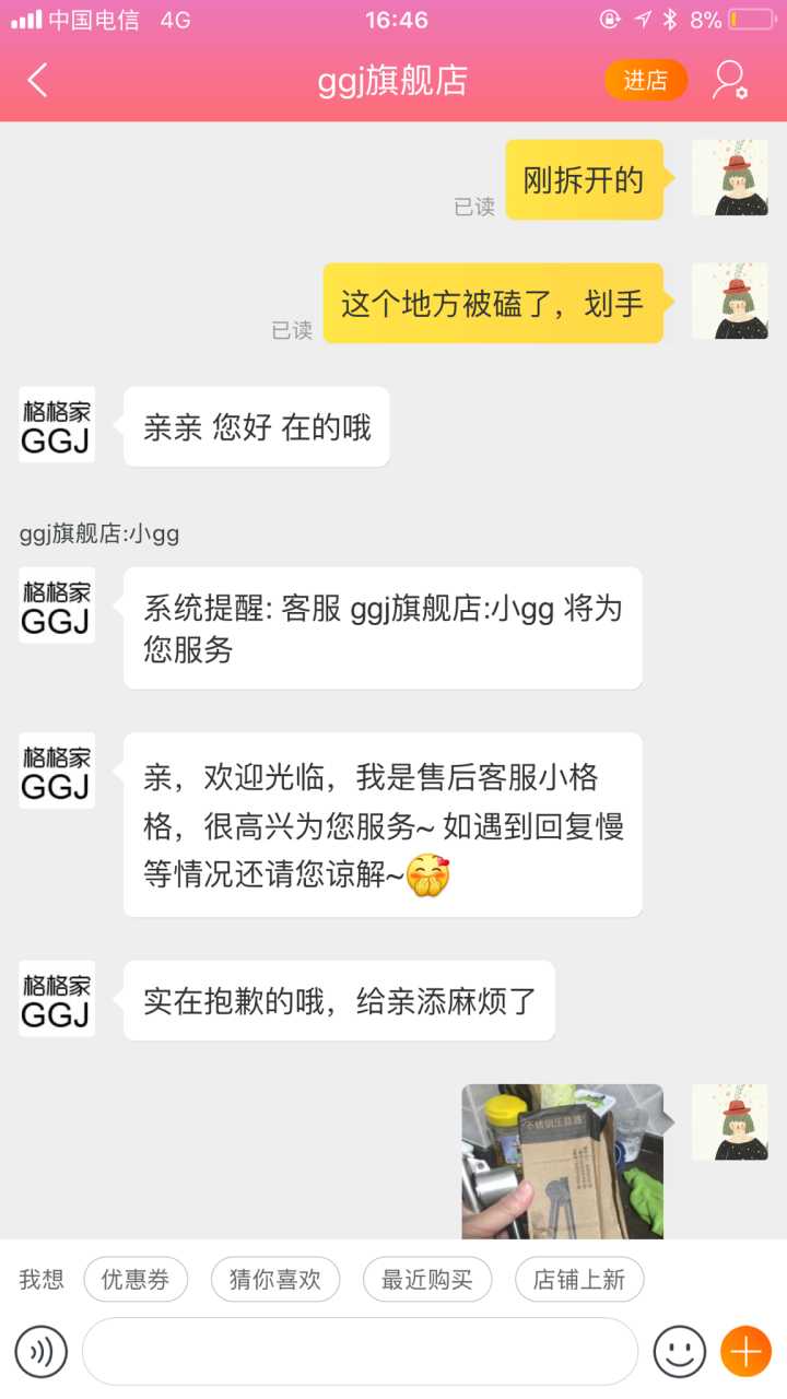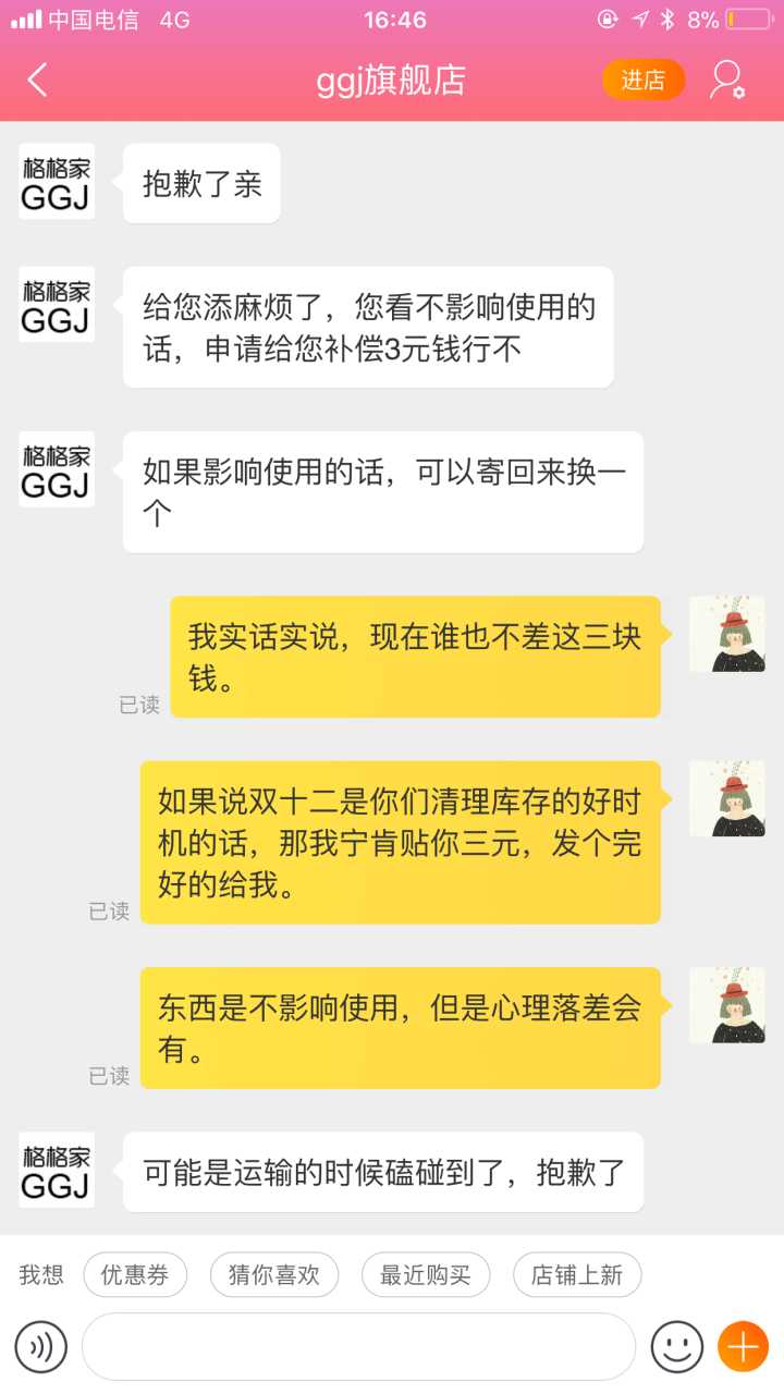 我总结一下,收到东西,把手处有一个磕口(划手),且有损坏的地方在把手上并不影响功能使用。我要求:换货。客服:NO!要么给我三块钱把我打发了,要么退了重新拍。想换没门!投诉随便!——态度我不能说很强硬吧,但至少这事儿他不肯退让,我也一样。