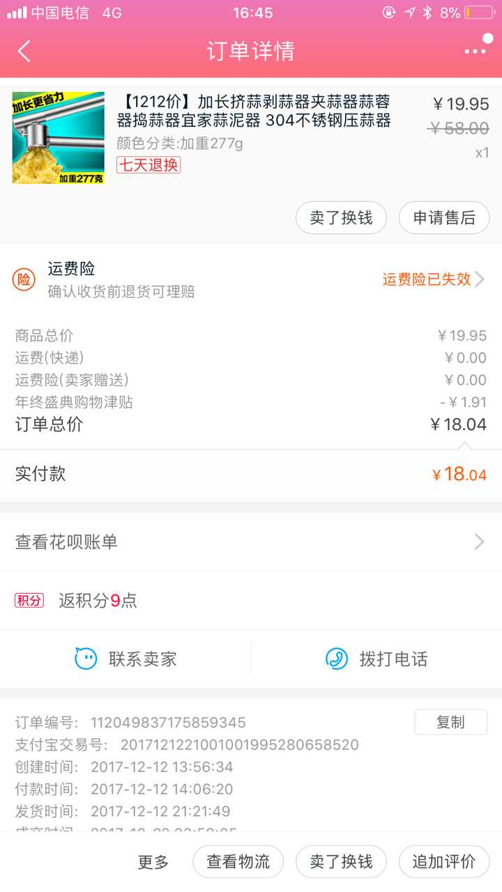 第三次,我打过去。过几天,我去查我的支付宝,没见有钱退回,于是工作日工作时间,我再次电话咨询这个压蒜器的事儿。客服说最多三个工作日一定退回。结果大概三小时不到,收到退款。