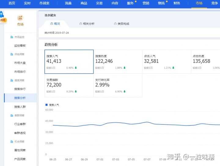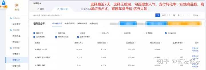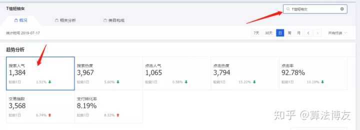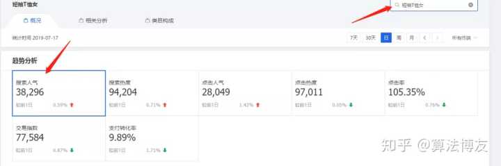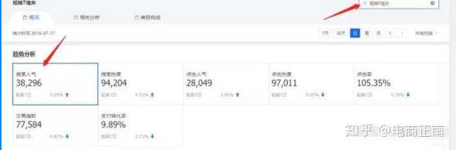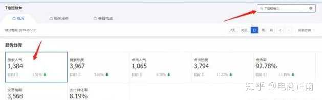 查看7天的数据,重点关注搜索人气,点击率,转化率,在线商品以及商城占比这5个数据。