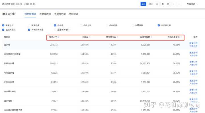 主要看三个数据:搜索人气、在线商品数、商城点击占比,