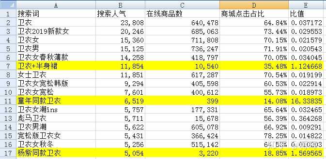 其中可以看到,用黄色标出的几个产品竞争都相对较小,尤其是“童年同款卫衣”,搜索人气是远远大于在线商品数的。