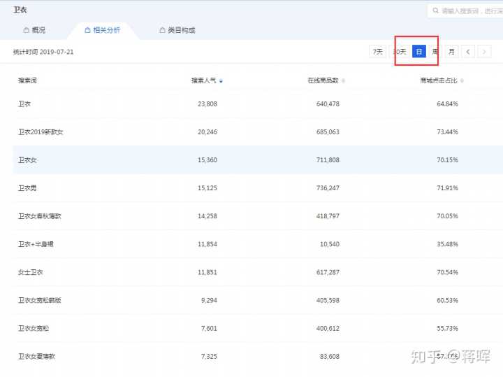 就以产品卫衣为例,通过“生意参谋-市场-搜索分析”,输入“卫衣”,然后按照搜索排名,注意这里是一天的数据。