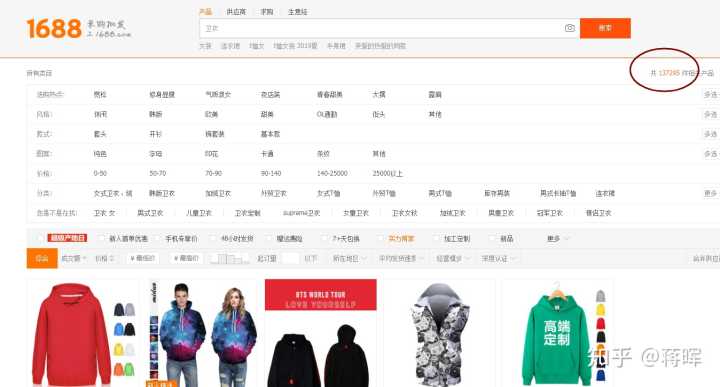 在搜索栏输入关键词“卫衣”进行搜索,会出来N多个产品。