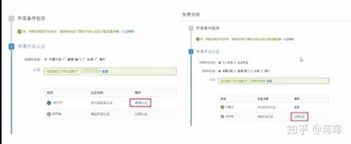 我们选择个人开店之后,有一个开店认证,会出现两种情况,一种是左侧出现的情况,继续认证,还有一种是右侧这种,立即认证。