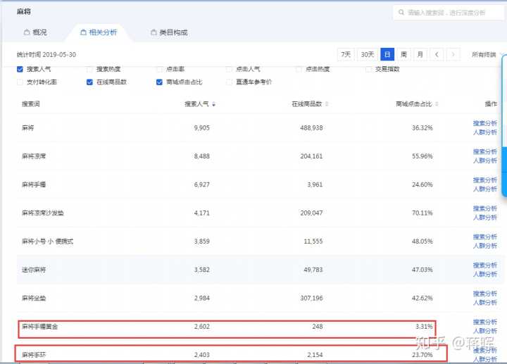 我用生意参谋搜索“麻将”时,很明显的看到“麻将手镯黄金”,这个细分市场在众多产品中,数据比较好。