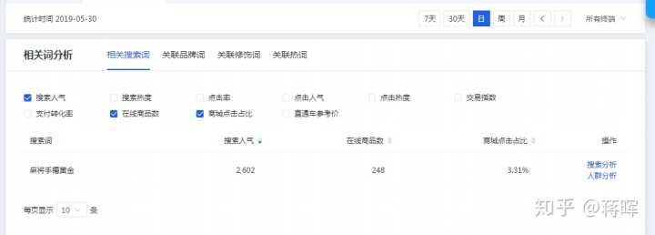 打开生意参谋-市场-搜索词分析,输入产品关键词——“麻将”,看能否找到搜索人气高、在线商品数比较少的细分市场。