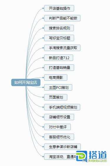 先思考一下一位新手开淘宝店需要做哪些工作?(下图是列出的一些主要工作,要做的事非常多)。