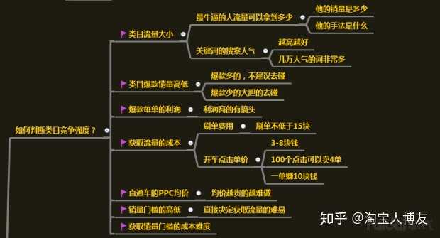 首先我确定这个类目现在top前几的商家他们的销量有多少,最大的流量来源是什么还有搜索人气比较高的词是哪些,最后还要计算我的流量成本是多少等等。