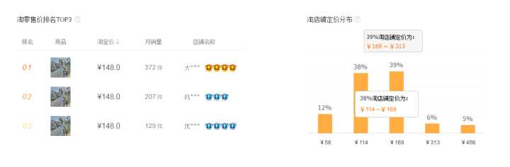 下面是淘宝零售价的排行以及店铺定价的数据。这款高腰裙零售排行中卖的较高且不错的店铺是卖到了148元。
