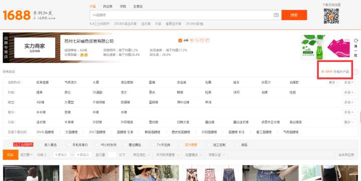比如今年的ins高腰裙比较火,输入关键词后进行搜索出很多ins高腰裙的相关产品,同时看到非常多的供应商。在页面的左上角可以查看到有6896件 ins高腰裙的相关产品。