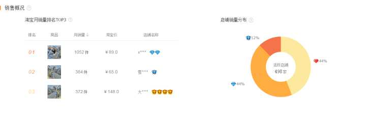 接着看淘宝月销量的数据,这款产品的单月销量数据是1758,平均一天60件的销量。对于在售淘店铺数量多好还是少好,很明显是少好,少意味着竞争小。