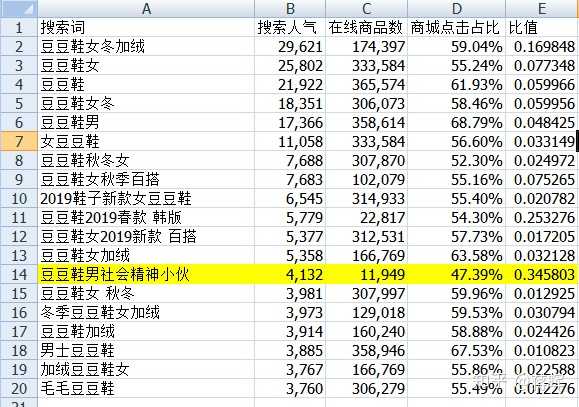 以上的词语是需要筛选的,将带有品牌或者知名明星的词语排全部删除,把搜索人气与在线宝贝数比值大于0.3的词筛选出来,一般数值定为0.5。(筛选标准根据具体类目决定,因为豆豆鞋竞争较大,所以定位0.3)