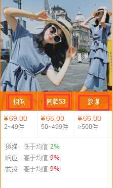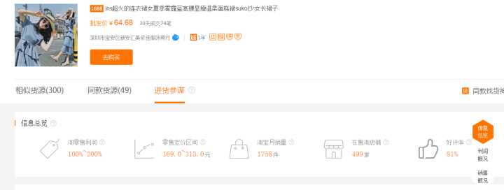 先看第一个淘零售利润,上面显示100%-200%,这数据代表在淘宝主流卖得好的店铺这款产品的售价的加价倍数,100%是加一倍,200%是加两倍。这款高腰裙的进价是64.68,也就是在淘宝零售中这款产品的主流价格是140多到200多,从这个数据可以看出这款产品在淘宝上还是有利可图的。