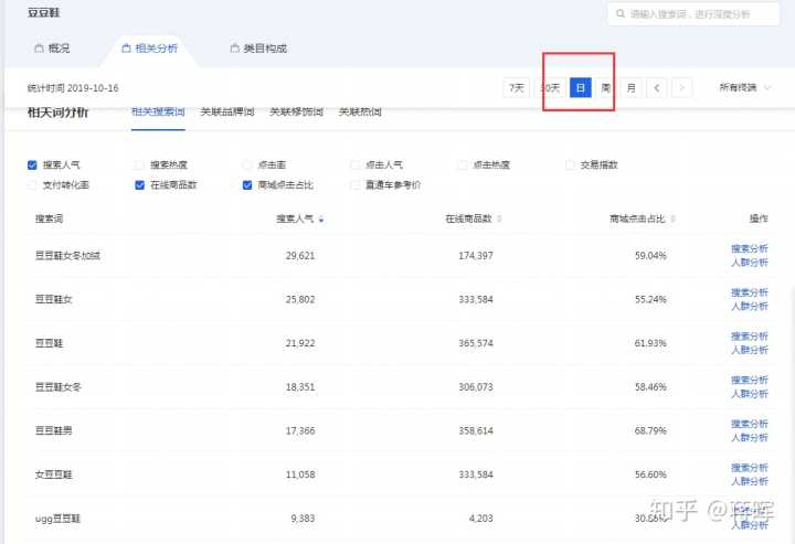 假设你销售的产品是“豆豆鞋”, 通过“生意参谋-市场行业-搜索词查询”,接着按照搜索排名,注意这里是一天的数据。