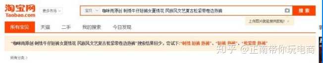 搜索【牛仔裤 女】,找到一款宝贝,搜索全标题,会出现这样的结果,“咖咪雨原创 刺绣牛仔短裤女夏绣花 民族风文艺复古松紧带卷边热裤”搜索结果较少,尝试下:“刺绣 短裤 热裤”、“短裤 热裤”“松紧带 热裤”。因为你搜的是全关键词,搜索结果很少,所以,淘宝就就根据你搜索的内容推荐了相关关键词。