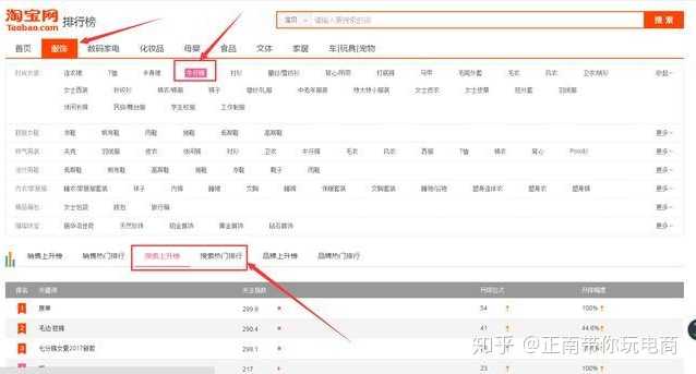 点击【更多》】这个超链接后,会跳转到淘宝排行榜页面,在这个页面,可以根据宝贝的类目属性选择相关内容查看该类目下,搜索上升榜和搜索热门排行榜的具体情况,了解到当前淘宝搜索上升或者热门的前100个关键词是什么。在排行榜收集好关键词后,依然添加到上面做好的九宫格中,这边的关键词,除了可以看到关键词本身是否符合店铺商品外,还可以查看关键词的关注指数,上升趋势等。如果筛选的关键词过多,九宫格放不下,可以将相对搜索量少或者与宝贝匹配度不高的关键词进行替换,或者在九宫格外在增加格子,做成回字格形式。在排行榜页面还可以通过销售上升榜和销售热门排行,了解同行销售好的卖家是怎么做产品标题的。给自己提供参考,但是不建议直接照搬人家的标题。