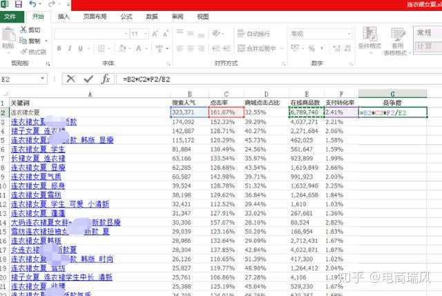 鼠标放到“竞争度”下面第一行,输入一个“=”号,然后鼠标移到搜索人气下面第一行,输入“*”号,鼠标再移到点击率下面第一行,输入“*”号,鼠标移到支付转化率下面第一行,再输入“/”号,点回车键,就是用这样一个公式:竞争度=搜索人气*点击率*支付转化率/在线商品数,从而算出关键词的竞争度数值,如图: