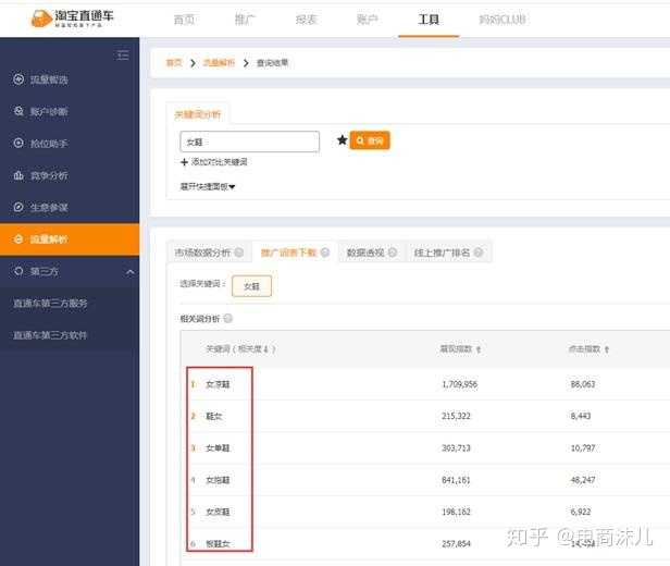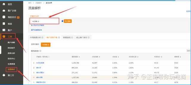 在直通车里面【工具箱】中的【流量解析】里面可以看到更多详细的数据,同时还有一定的联想功能,就是根据搜索的关键词,筛选出,可能相关的关键词,除了有关键词展现,点击等基础数据外,还增加了竞争度指标。同时在页面还推荐了关键词所属类目下的热门词,这下选词是不是更简单了。