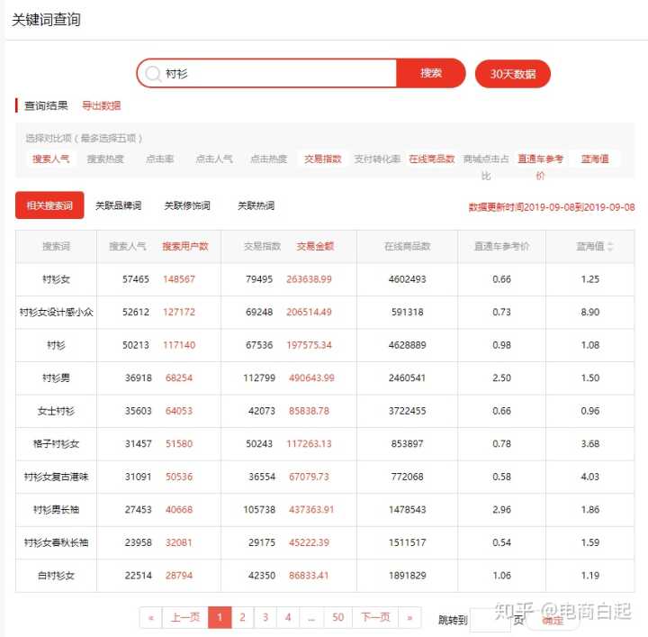一般我们主要看搜索人气,交易指数,在线商品数,直通车参考价以及蓝海值,而下方就是搜索词的数据,我们可以看到搜索人气和交易指数旁边分别有两列的红色字体,这里的搜索用户数和交易金额就是指数换算之后的真实数据,我们在参考关键词数据的时候,主要看红色字体就可以了。而蓝海值则是判断一个关键词是否具有蓝海潜力的指标,追求蓝海市场的商家可以着重看蓝海值。
