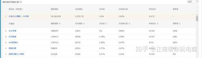 首先打开查电商的行业数据,选择查关键词,输入想要查询的关键词,我们可以通过相关搜索词,进行标题的组合和排序。我们看到选择对比项这里有多个维度可以进行参考。