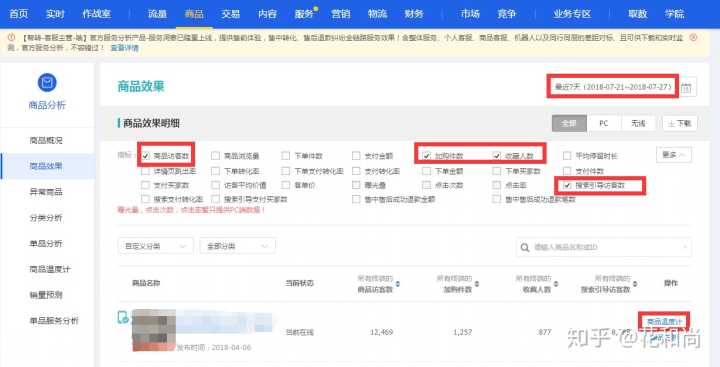 按照上面的步骤把你自己的店铺的生意参谋打开,对照勾选好之后,会看到最近7天给你店铺中带来访客最多的产品。接着点击右下角的“商品温度计”