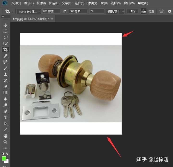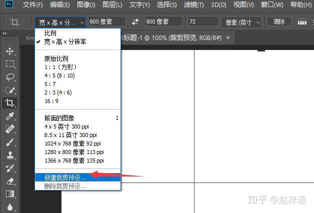 6.打开要裁切的图片,选择裁切工具,或者(英文状态下快捷键”C”),选择比例下拉菜单刚才新建的尺寸预设,调整好大小,双击左键确定即可,ctrl+s保存一下即可,图片就变成800×800像素的了